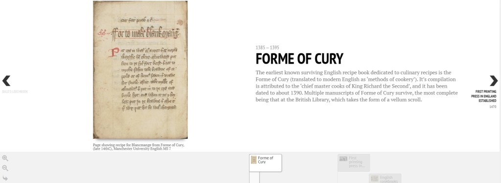 Flipping the exhibition to the timeline format was pretty easy, provided you have access to a google drive, and your images are hosted somewhere online. TimelineJS requires you to add your descriptive data and links to the images into a spreadsheet template. You follow some simple instructions to make the document public via google drive, and paste the URL into the Knight Lab website, which will generate the URL of your timeline. With most of the content already created for Sway, it took barely any time to adapt the content for my new (still very brief) cookbook timeline.